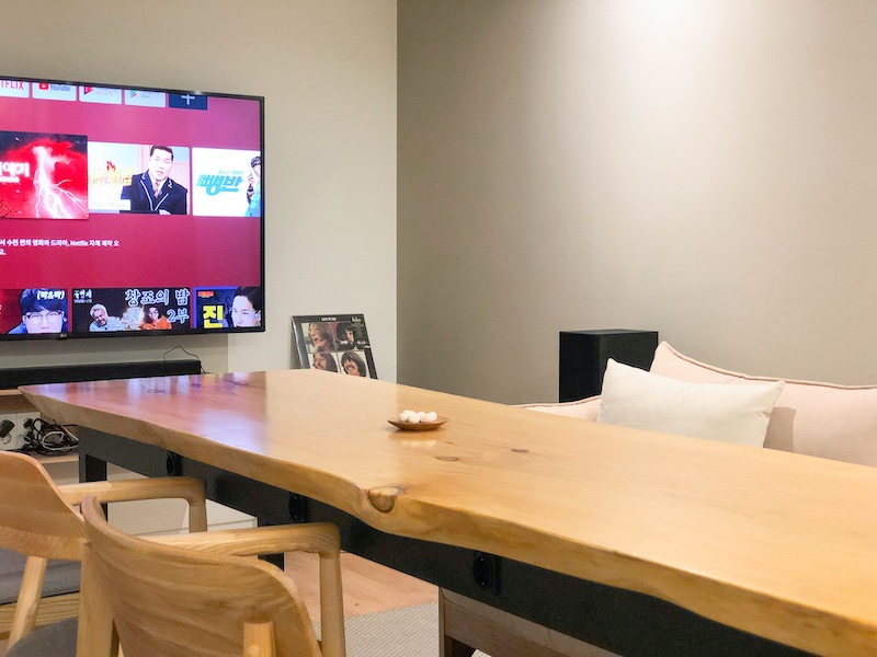 소규모 미팅, 프리젠테이션, 영화 감상 등 프라이빗하게 몰입할 수 있는 다목적 공간으로, 8인용 커뮤니티 테이블과 스마트 TV가 마련되어 있습니다.
